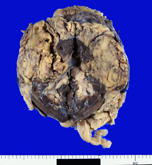 - 通常分葉状で黄色, わずかに油脂状の腫瘤。平滑筋が主要成分の場合は灰白色で硬い。出血はよく起こり症状のある例ではとくにありふれた現象である。腫瘍全域におよぶ出血もありうる。