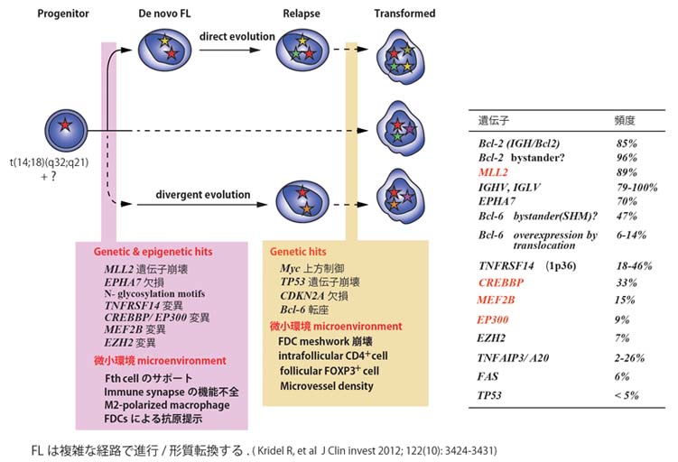 FLのdiagnosis/ relaps時においてexome sequencingにより, 3段階の変異モデルが考えられる.