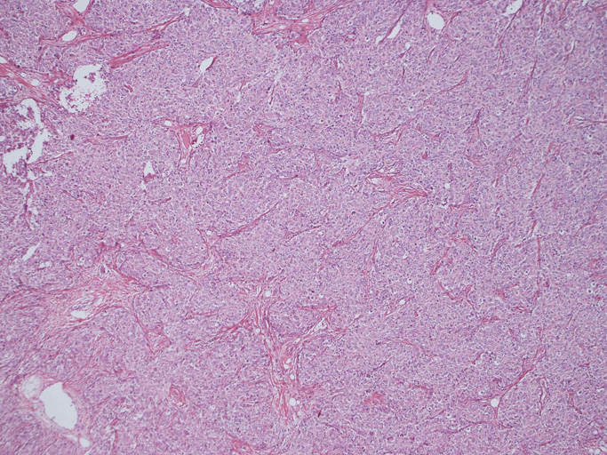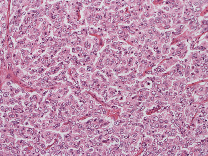 腫瘍は, 細血管を含む細い線維組織束で分画された胞巣状充実性病変で(Fig01),類円形ないし卵円形のvesicularな核をもつ円形, 多稜形の細胞が増殖している。核小体は小型, やや不明瞭。細胞質は境界が不鮮明で好酸性泡沫状を呈するものが多い。大型核やbizzarreな核の出現も認められる(Fig02-05)。血管周囲にリンパ球浸潤が認められる部分がある(Fig06,07)。