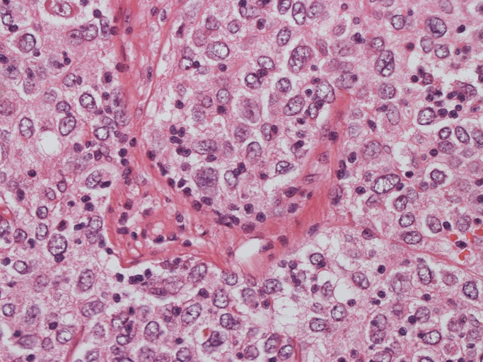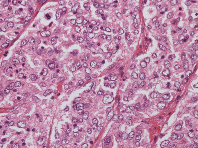 - 個々の腫瘍細胞は卵円形核を有し, 核膜は薄く, クロマチンは核縁により核小体は不鮮明あるいは相対的に小型である。多核(分葉核)や核内偽封入体を認めることもある。核分裂の頻度は低い。