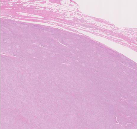 - 卵円形, 紡錘形および多稜形細胞の束状, 充実性, ときに渦巻状増殖巣などからなる。濾胞性リンパ腫様の濾胞構造をともなうこともある。