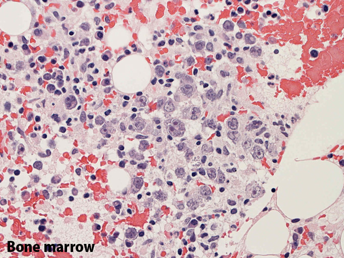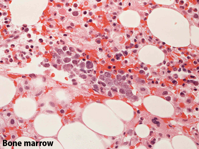 File not found: BM02_s.jpg File not found: BM03_s.jpg 骨髄;細動脈内のみに腫瘍細胞が認められた。類洞や髄内での増殖は見られなかった。