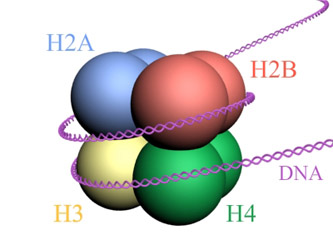 ヒストンコアはヒストン分子H2A, H2B, H3, H4の8量体からできている(右図)