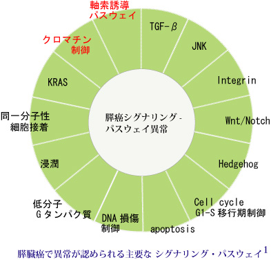 膵癌において従来より知られている, KRAS, CDKN2A(p16), TP53, SMAD4の癌遺伝子, 癌抑制遺伝子が高頻度に変異している他, 1症例あたり, 平均63個の遺伝子変異(ほとんどが点突然変異)が検出された。pathwayの解析から変異は, ほとんどの癌で12のコアシグナルパスウェイの67から100%におよんでいた。