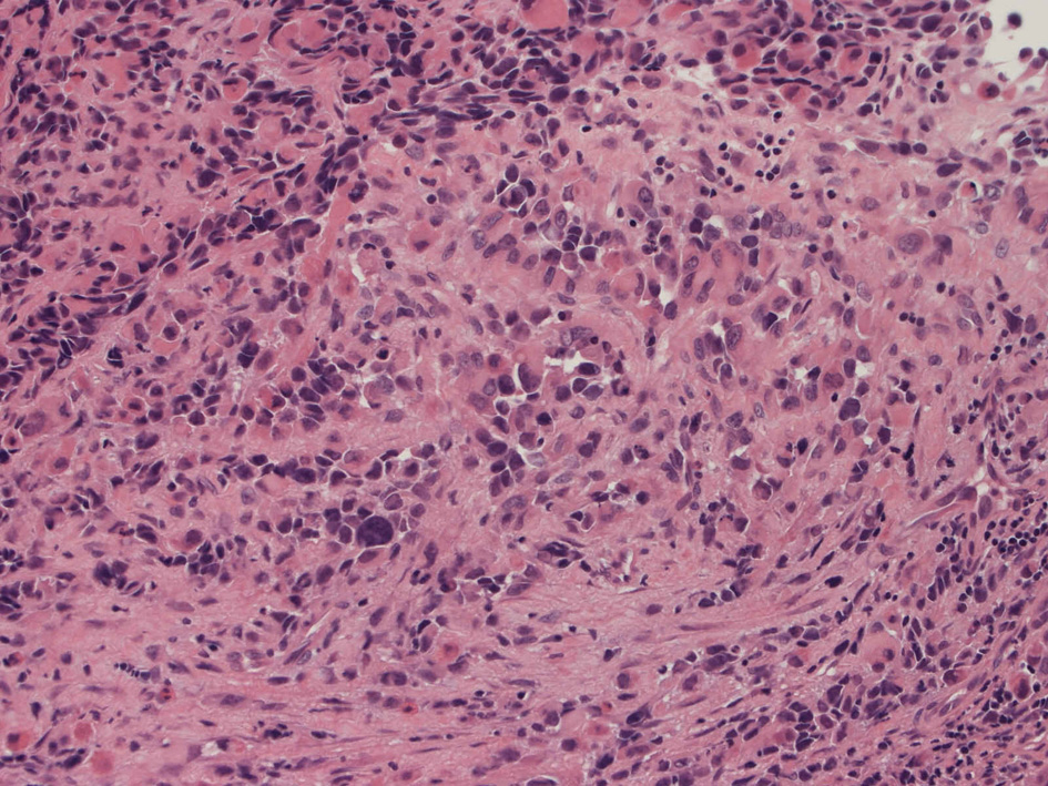 右頸部のしこりを自覚。近医MRIで頸部多発リンパ節腫大あり当院を紹介される。右顎下, 右鎖骨上窩にも多数のリンパ節を触れる。穿刺細胞診ではcarcinoma疑い。右鼻腔, 上顎洞にも腫瘤が認められリンパ節腫大との関係を調べるために鼻腔腫瘤の生検が行われる。