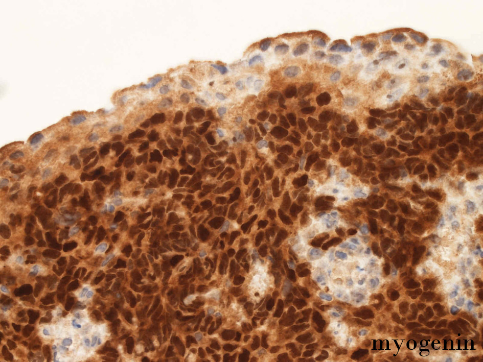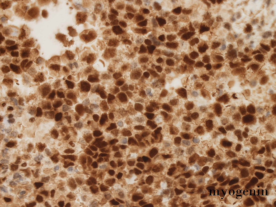 small round cell tumorの中でrhabdomyosarcomaは腫瘍細胞に種々の抗原が陽性となるため診断を誤ることがあり注意が必要である*1