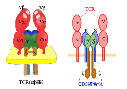 - TCRはさらにCD3という分子群(γδεζ)と複合体を形成している