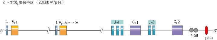 - γ鎖遺伝子はヒト第7染色体7p14(マウスは第13染色体)に局在する. ヒトでは5個のJγ遺伝子, 14個のVγ遺伝子が同定されている.