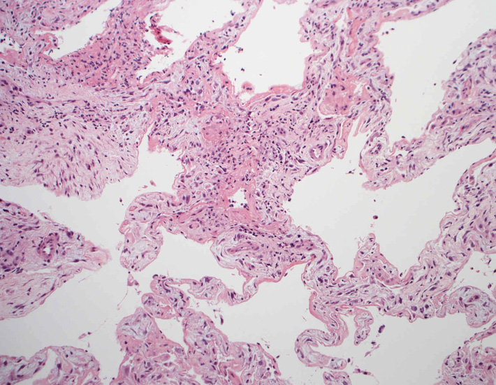肺胞壁に多数の好中球浸潤。肺胞腔内に出血。 capillaritisが起こるWegener' granulomatosis劇症型には, なかなか肉芽腫性病変を見つけることは難しい