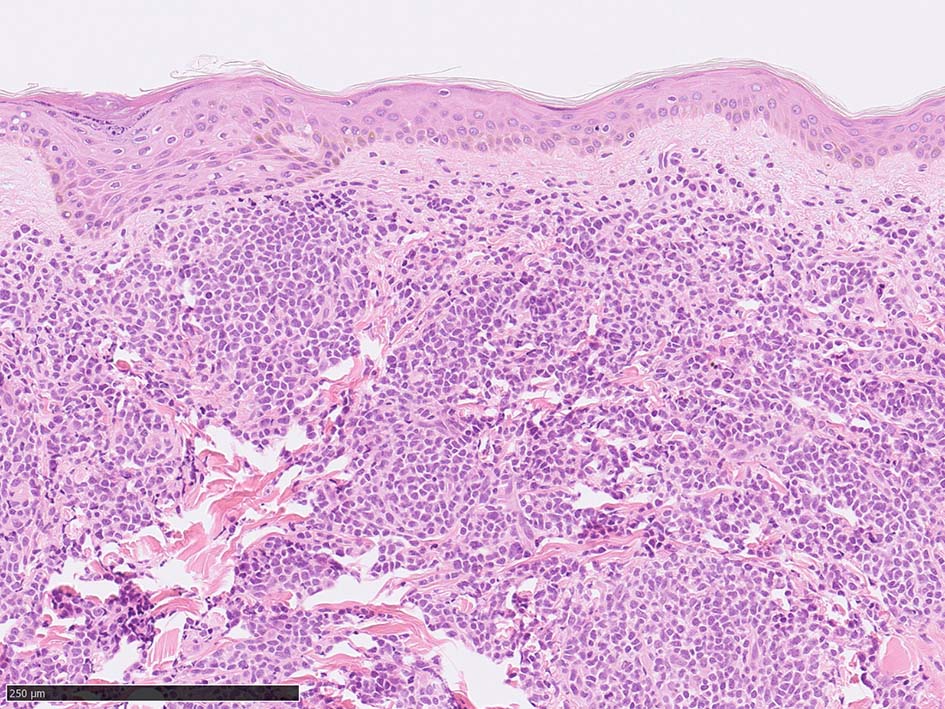 腫瘍細胞は真皮を主座として, 皮下脂肪織まで, びまん性かつ単調monotonousに増殖することが多く, 表皮向性はみられない.