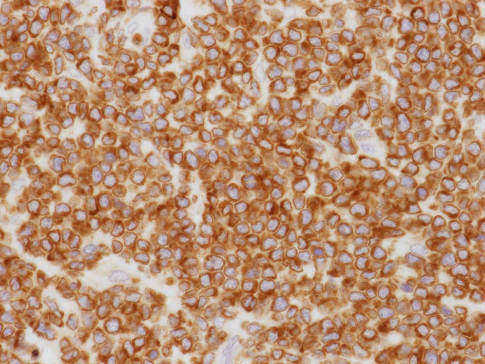 左肘窩リンパ節の病理診断は T-lymphoblastic lymphoma(T-LBL)になる. 1年後の再発で, 精巣リンパ腫と異なったものが発症するとは考えにくく, 精巣病変にTdT, CD99, CD34, CD117を追加染色した.