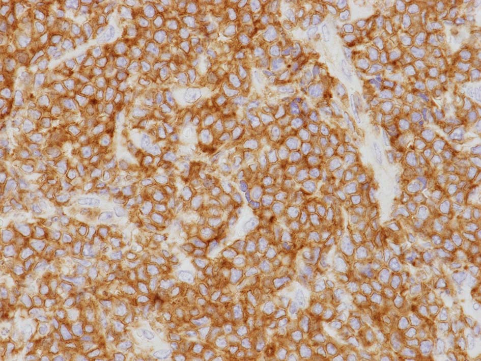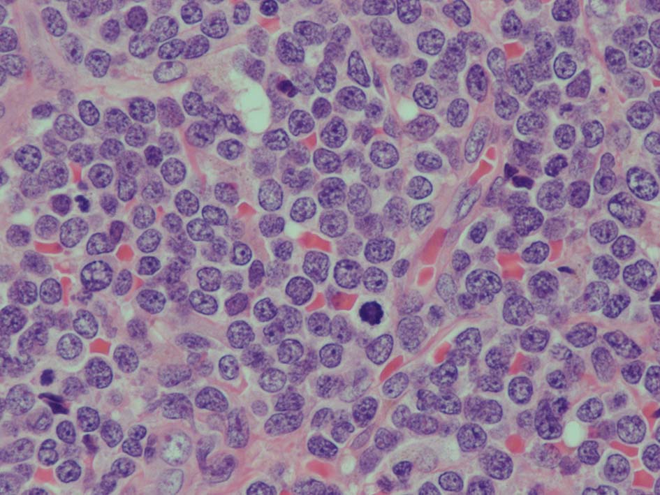 左肘窩リンパ節は正常構造を消失. 類円形の繊細なクロマチンをもつ,核小体の明瞭な核をもつN/C比大の細胞が密に増殖している. 精巣の成熟したリンパ球とは核所見が異なる(白膜増殖部には類似の細胞が認められていた).