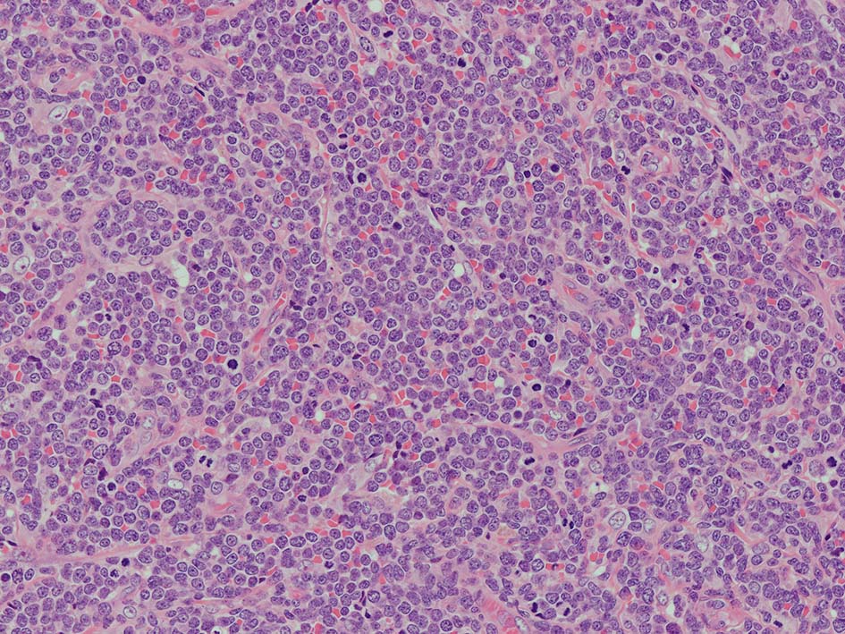 loupe像Aの領域: 精細管をスペアするように, 小型リンパ球優位, 一部中型のlymphoid cellsがシート状密に浸潤増殖する. tubulesのほとんどにはlymphoid cellsが浸潤していないが, LELに似たようなlympho-tubular lesionが少数認められた. x400高倍率では, 増殖細胞は, 粗く, 凝集したクロマチンをもつ類円形, non-cleavedな核をもつ細胞質の乏しいlymphoid cellsである. 核小体か凝集したクロマチンかわかりにくい.