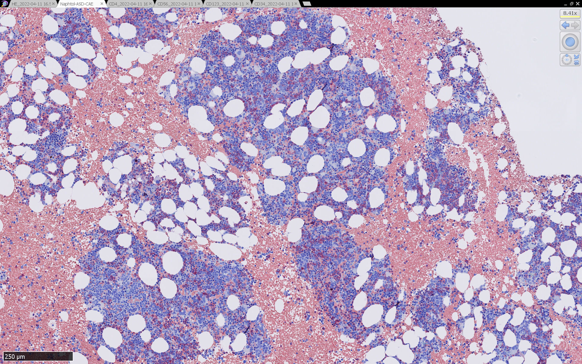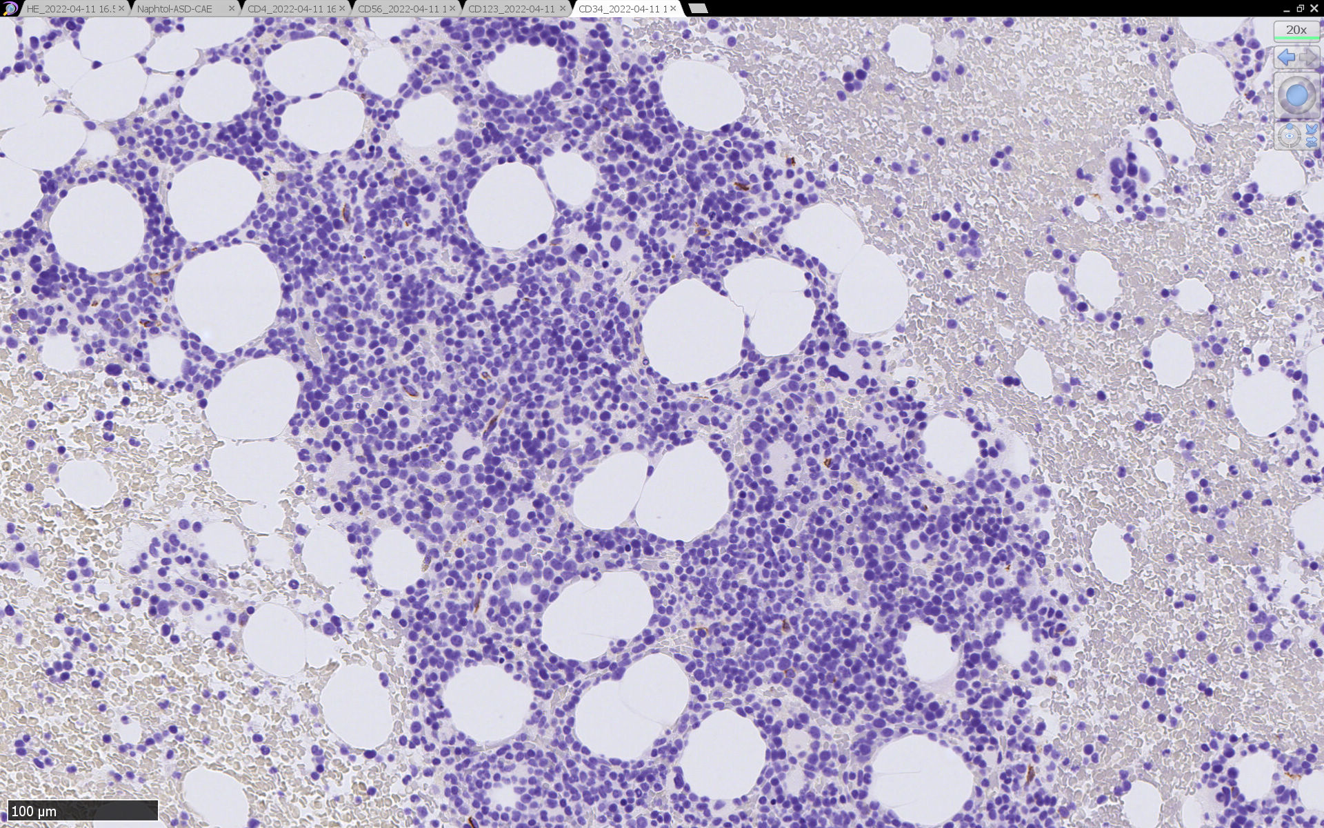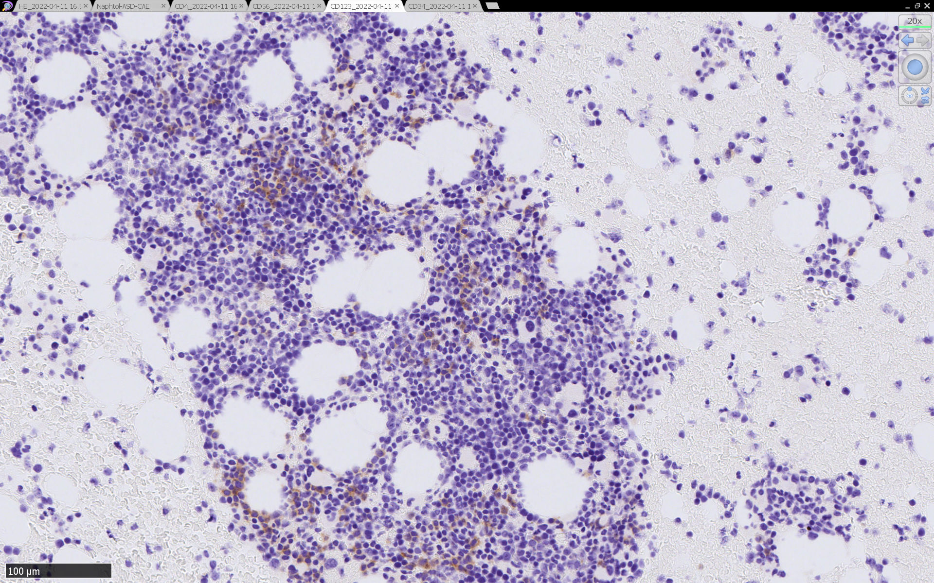 CD4は染まりすぎの感がある(濃く染まる細胞はCD4+ T-cellかもしれない). CD56, CD123が陽性で可能性が高くなり, BPDCNの診断にはCD34は陰性であることが必要。