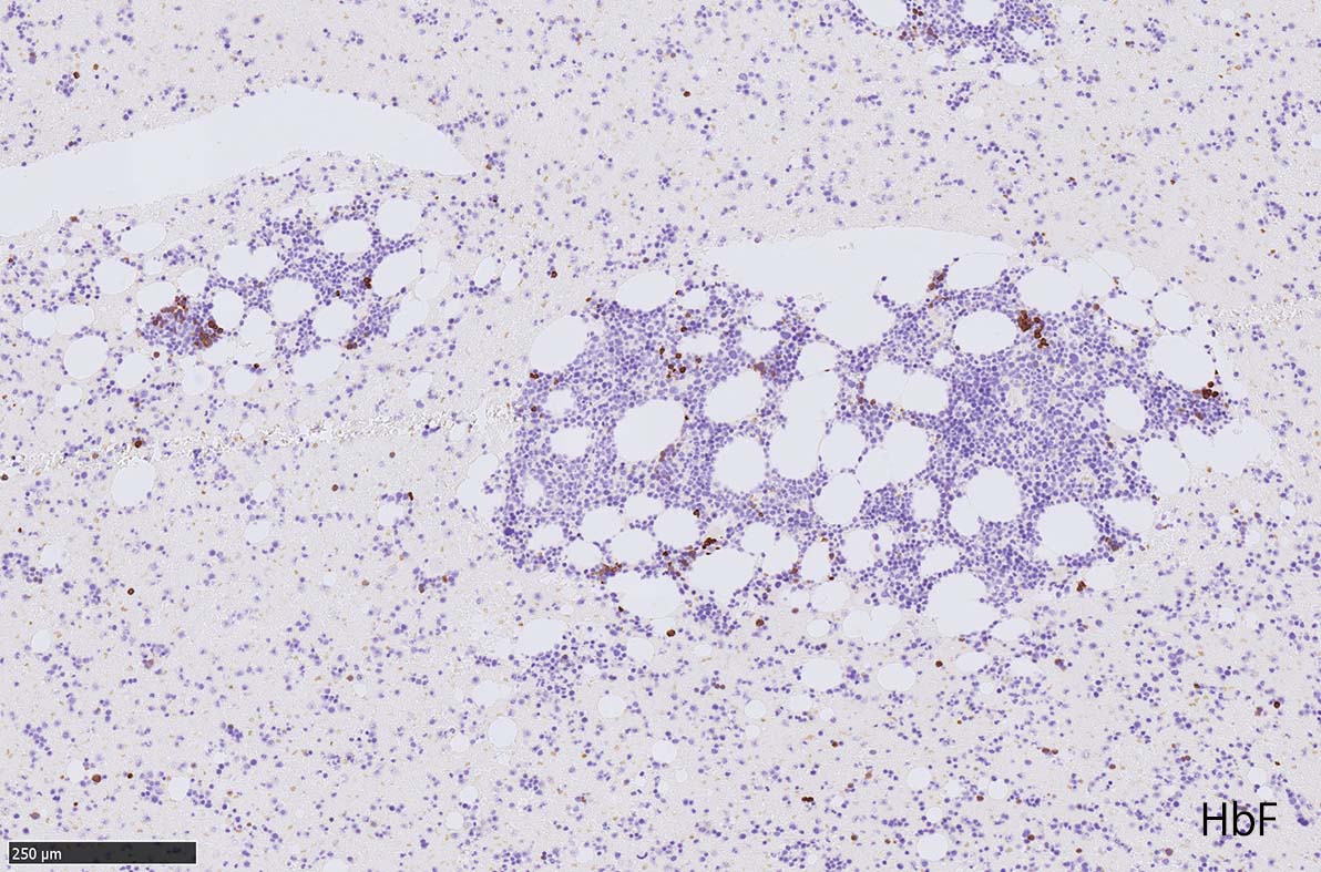 免疫染色では, HbFを発現する赤芽球の集簇巣が散見しているほか, p53陽性細胞が軽度に増加している. CD34陽性細胞増加はなし.CD42b染色でmicroMgkはみられなかった. 異形成造血が強く疑われる.