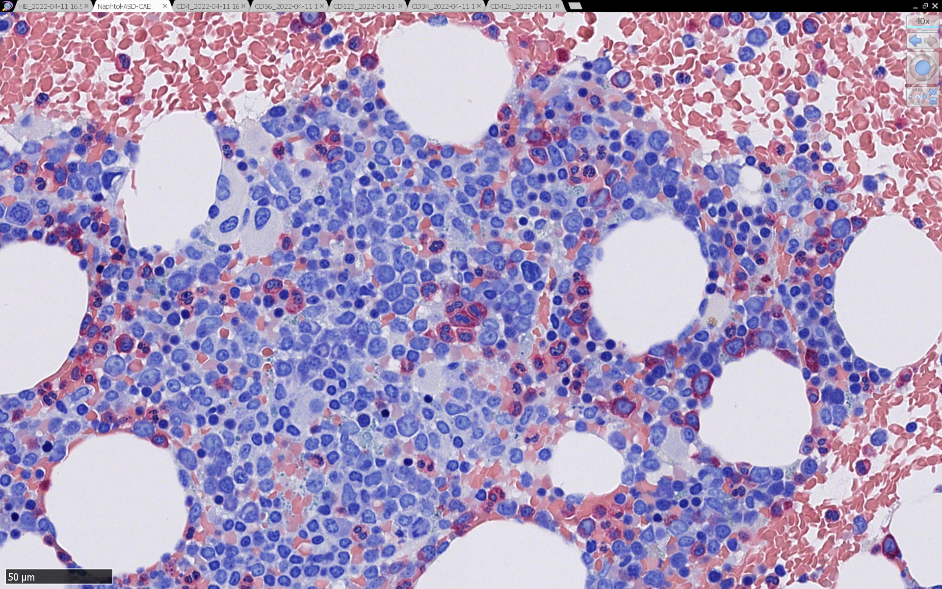 HEでは腫瘍細胞の同定が難しい. 本症例は ASD-Giemsa染色を見ても, 腫瘍胞巣はよくわからなかった. 皮膚が先に診断がつき, 次いでBone marrowだったため, 免疫染色にすすめたが, Bone marrowが先だと診断に困ったかもしれない. 本例は, 骨髄がhypercellularで, dysplastic hematopoiesisがありMDSも疑われている.