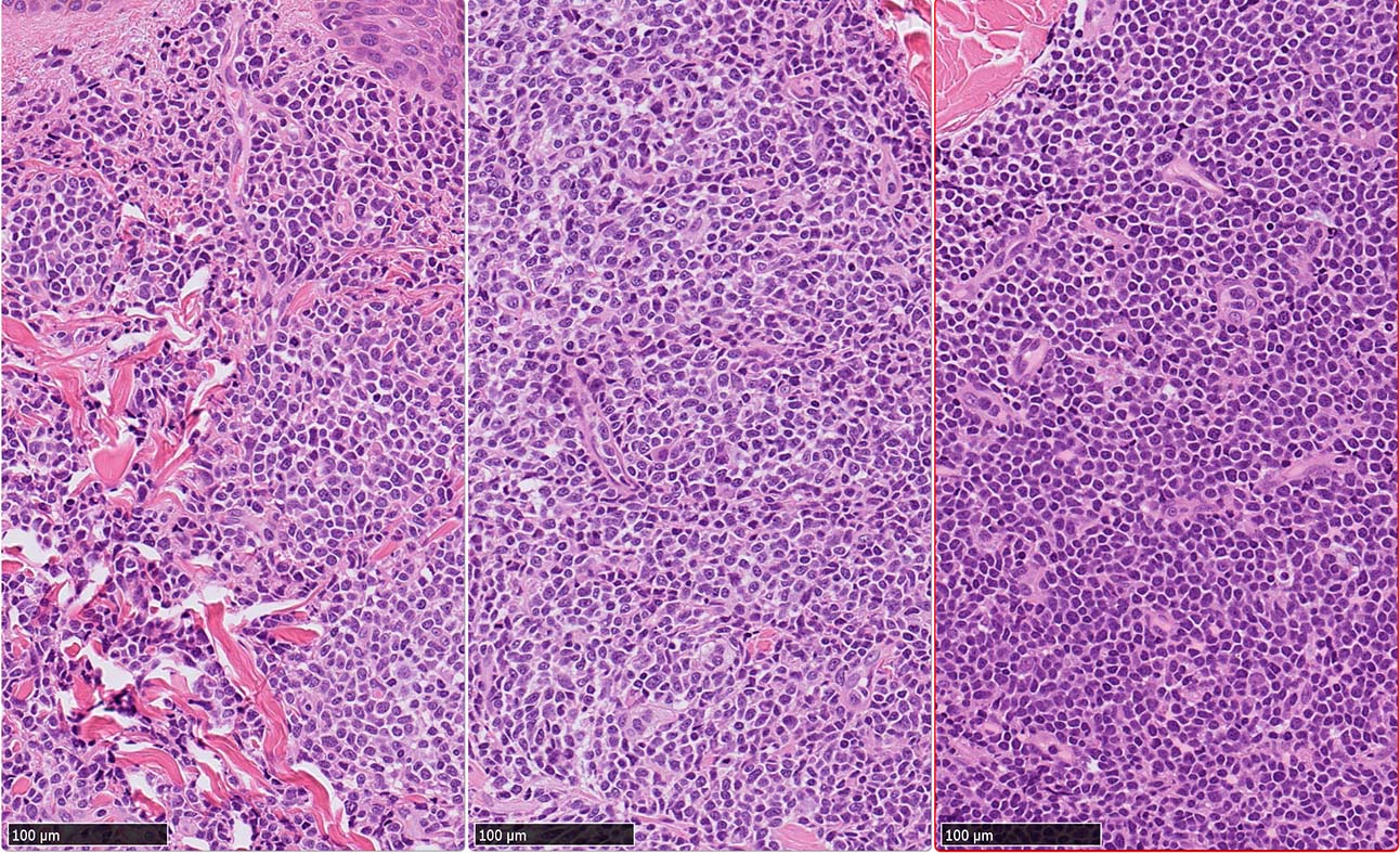 腫瘍細胞は真皮を主座として, 皮下脂肪織まで, びまん性かつ単調monotonousに増殖することが多く, 表皮向性はみられない. 本例では血管や付属器中心あるいは脂肪織内に結節状の浸潤増殖を示した.