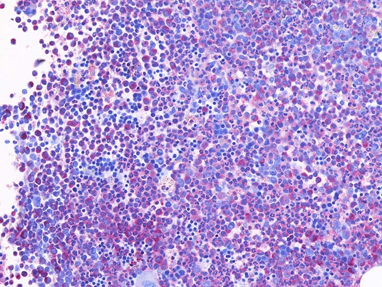 Fig.01: hypercellular marrow. ASDで赤染する細胞の増加=granulopoietic hyperplasiaがある.