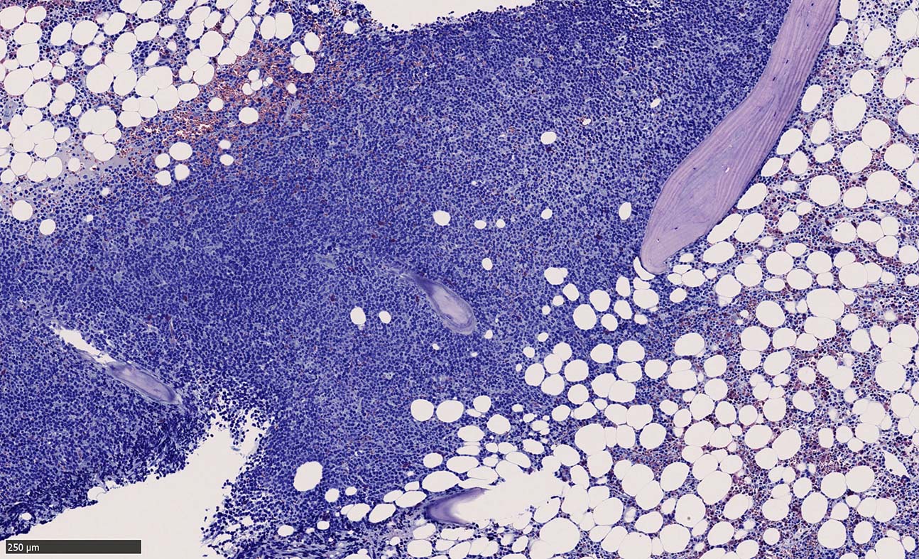*1 Cohen PL, Kurtin PJ, Donovan KA, Hanson CA: Bone marrow and peripheral blood involvement in mantle cell lymphoma. Br J Haematol 1998; 101: pp. 302-310. *2 Pittaluga S, Verhoef G, Criel A, et. al.: Prognostic significance of bone marrow trephine and peripheral blood smears in 55 patients with mantle cell lymphoma. Leuk Lymphoma 1996; 21: pp. 115-125. *3 Weisenburger DD, Vose JM, Greiner TC, et. al.: Mantle cell lymphoma. A clinicopathologic study of 68 cases from the Nebraska Lymphoma Study Group. Am J Hematol 2000; 64: pp. 190-196. *4 Samaha H, Dumontet C, Ketterer N, et. al.: Mantle cell lymphoma: a retrospective study of 121 cases. Leukemia 1998; 12: pp. 1281-1287. *5 Bertini M, Rus C, Freilone R, et. al.: Mantle cell lymphoma: a retrospective study on 27 patients. Clinical features and natural history. Haematologica 1998; 83: pp. 312-316. *6 Wasman J, Rosenthal NS, Farhi DC: Mantle cell lymphoma. Morphologic findings in bone marrow involvement. Am J Clin Pathol 1996; 106: pp. 196-200. *7 Schenka AA, Gascoyne RD, Duchayne E, Delsol G, Brousset P: Prominent intrasinusoidal infiltration of the bone marrow by mantle cell lymphoma. Hum Pathol 2003; 34: pp. 789-791. *8 Viswanatha DS, Foucar K, Berry BR, Gascoyne RD, Evans HL, Leith CP: Blastic mantle cell leukemia: an unusual presentation of blastic mantle cell lymphoma. Mod Pathol 2000; 13: pp. 825-833. *9 Wong KF, Chan JK, So JC, Yu PH: Mantle cell lymphoma in leukemic phase: characterization of its broad cytologic spectrum with emphasis on the importance of distinction from other chronic lymphoproliferative disorders. Cancer 1999; 86: pp. 850-857.