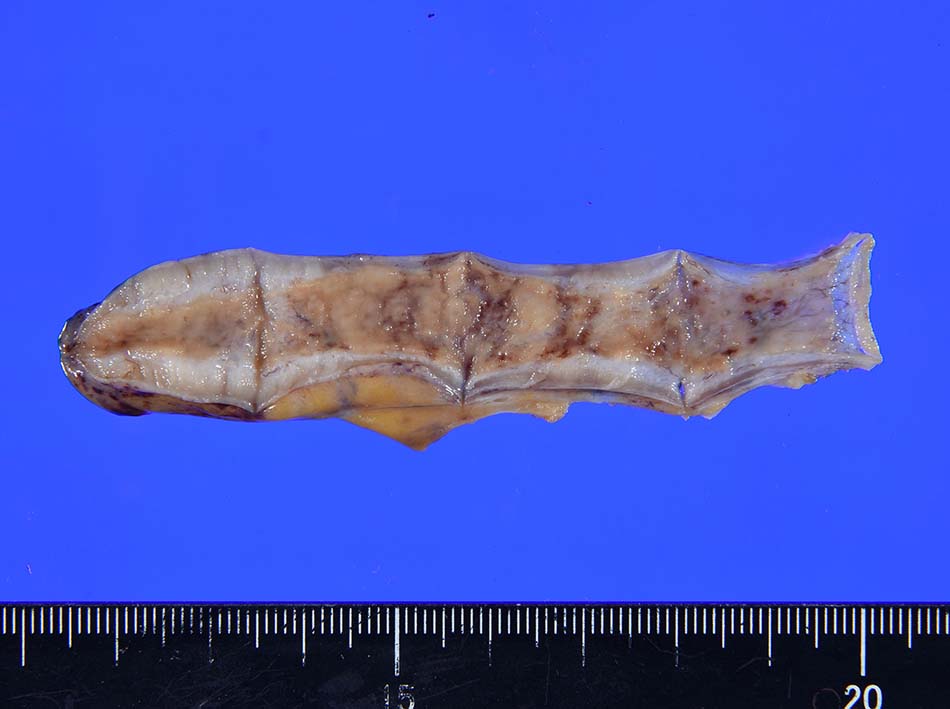 虫垂末梢側で壁が肥厚している. 糞石はない.