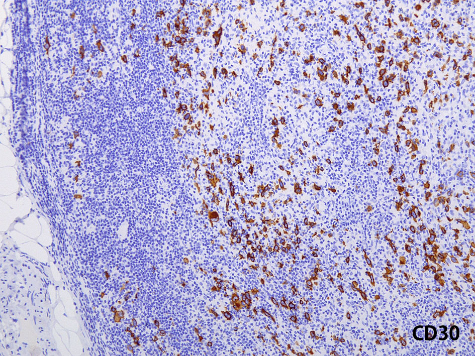 CD30, CD15は陽性, 転写因子のBob.1, OCT2は腫瘍細胞は陰性となる.