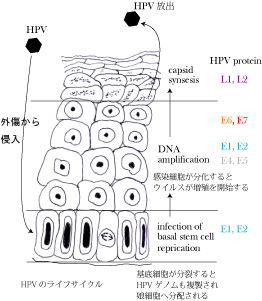HPVゲノムは8つのウイルスタンパク質しかコードしていないため, 宿主細胞のタンパク質機能をウイルス増殖期に最大限に利用する必要がある. HPVが増殖を開始する頸管粘膜の傍基底細胞は通常, 細胞増殖を停止し, 分化に向かっている。