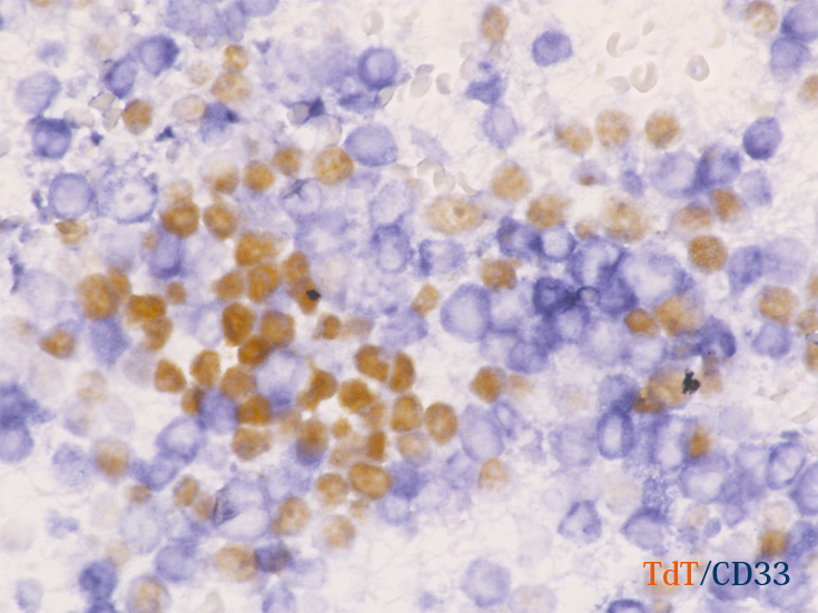 芽球はCD19陽性で, CD10, CD79aが陽性を示す。またMPO陽性芽球が領域を異にして染色された. CD19, TdT陽性の芽球とは別個の芽球であることが二重染色(骨髄球系マーカはCD33で示したが)でも推察される。CD20, CD3は陰性.