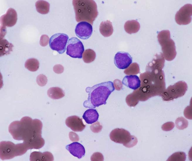 類円形あるいは, シワのみられるconvolutedな核に核小体をもつN/C比大の細胞が増加している. クロマチンは微細で核は淡明にみえる.Naphtol-ASD-CAE染色陰性.幼若あるいは活性化されたリンパ球様細胞に似ている.