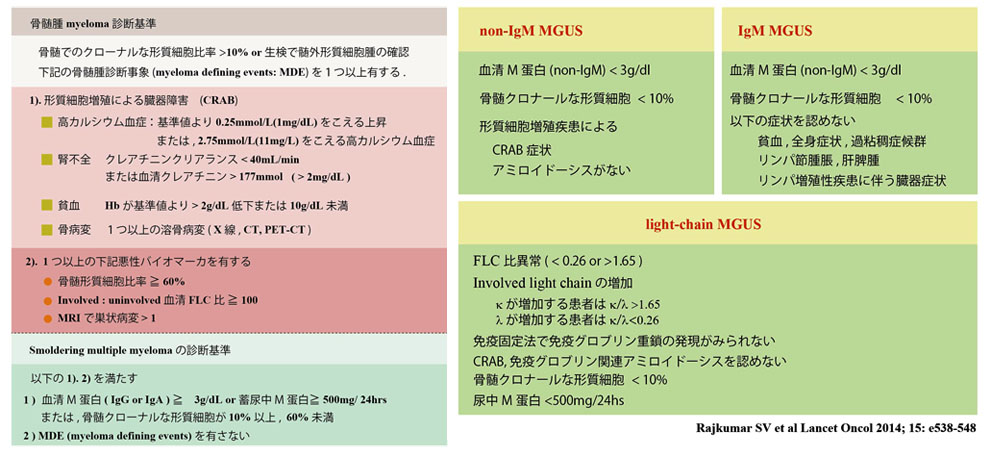 ● 新たな骨髄腫バイオマーカのSLiM基準(骨髄単クローン性形質細胞≧60%, 遊離軽鎖比≧100, MRIで骨病変>1)が従来のCRAB基準に追加された.