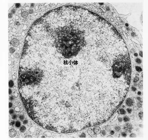 1-3µmの不定形で1個から複数個が核内構造体(核マトリックスなど)とともに核骨格を形成している