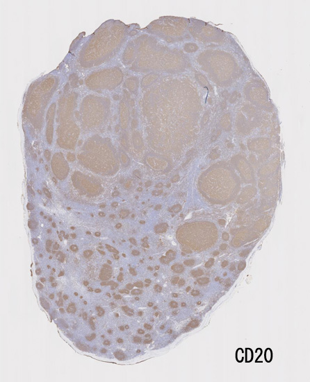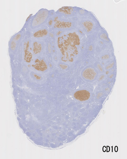 不整形の胚中心(CD20+, CD10+, BCL2-)のまわりにはCD5陽性リンパ球が多く存在してマントル層を形成している. (IgD染色でもマントル層はよく認識できる). 胚中心内のCD5+ cellはfollicular helper T-cellのようです.