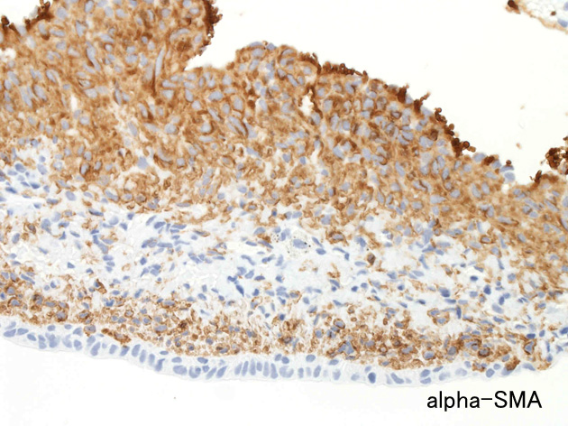 LAM cellの免疫染色--SMA, desmin, vimentin(vimentinはいつも陽性とはならない)が陽性となりmuscle lineageであるが典型的な筋細胞と異なり,