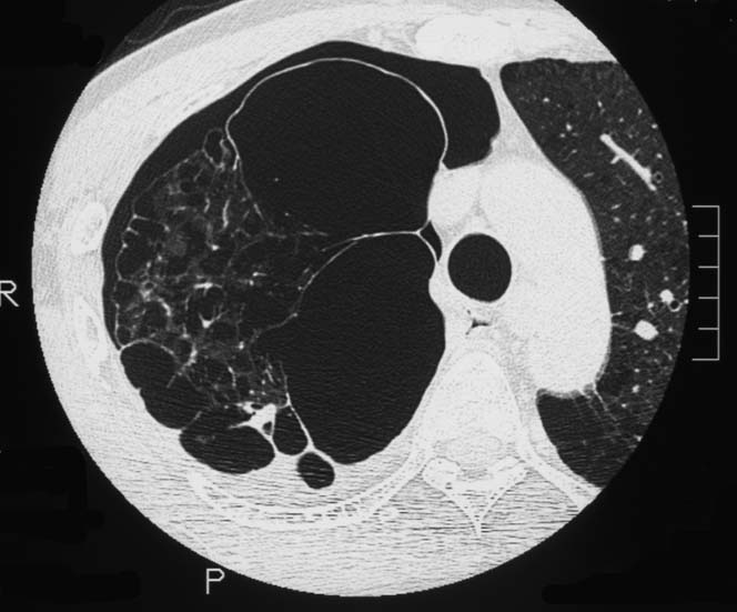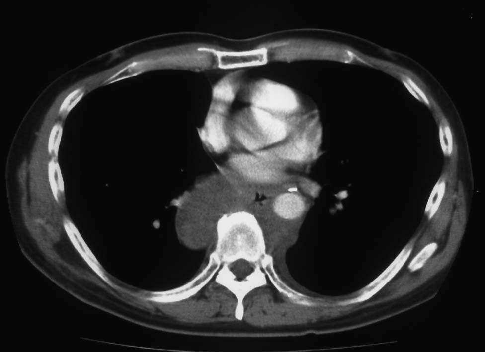 胸腔鏡下ブラ切除術5ヵ月後, 縦隔腫瘤で再発. 他院で腫瘍切除+右肺上葉切除を施行. 肉眼的には腫瘍は完全に切除できた.