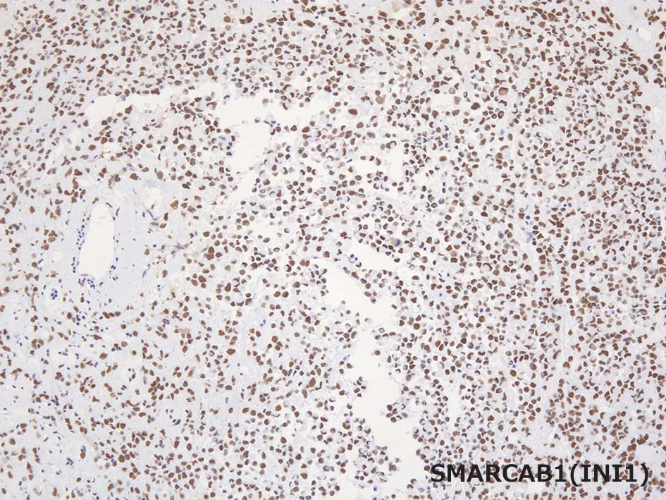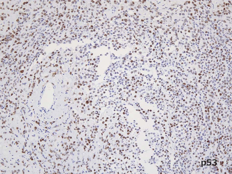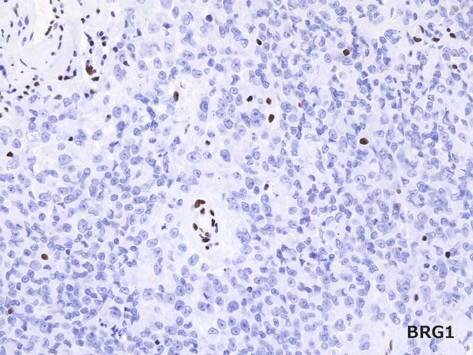 BRG1は核染色性が消失. internal controlの血管内皮や炎症細胞は核に陽性となる. INI1(SNF5/SMARCAB1)はびまん性に陽性. p53が多くの腫瘍細胞に陽性となる.