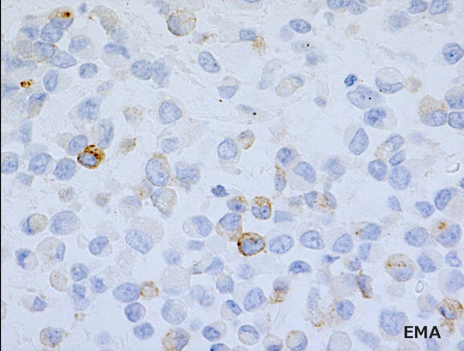 球状の封入体様にみえる構造が出現し, 核偏在や核を圧排し, 三日月/半月状の核がみられている. mitosisが散在. 形質細胞が少数混在して認められる.