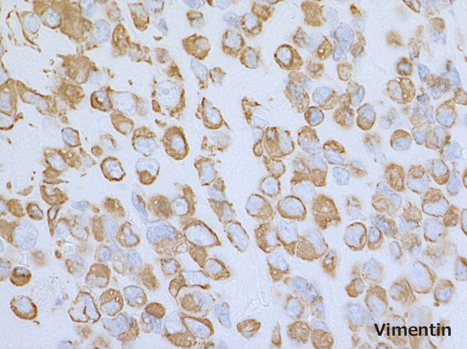 軽鎖がわずかに陽性となり, 最初 plasmacytomaとDxされたが他のmyeloma marker陰性, light chain PCRはnon-clonalパターンであった.追加の免染で, vimentin, CD99(MIC2)陽性、CD34, BCL2がごく一部に陽性など分化不明の肉腫.