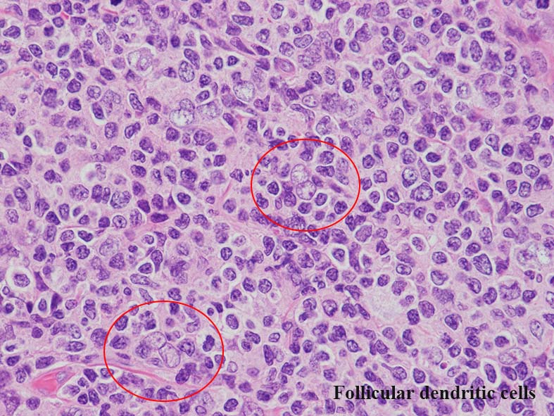 抗原提示細胞の多くは follicular dendritic cellであり, 提示抗原からmyofibroblastの特殊型細胞で骨髄のstromal cell前駆細胞由来と考えられている.通常この細胞は組織学的に区別しがたいが, 微細な傾向のクロマチン, 明瞭な小型核小体をもち細胞質が不明瞭な2核/多核細胞(Warthin-Finkeldey cell)があればfollicular dendritic cellとして区別できる.