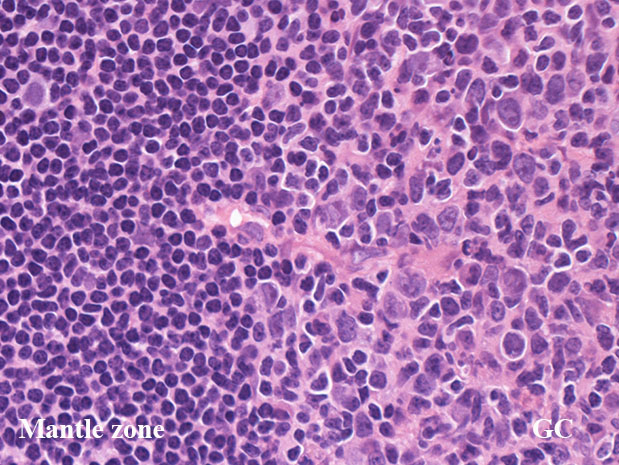 germinal center(GC)は, B細胞, T細胞, 抗原提示細胞, tindible-body macrophageが混在して構成されている. B細胞が優位に多く, small/ large cleaved cell(centrocytes)とlarge non-cleaved cells(centroblasts)が認められる。