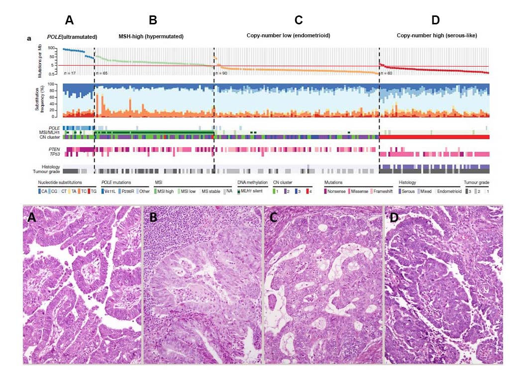 近年, TCGA(The cancer genome Atlas) resrch networkにより類内膜癌と漿液性腺癌の統合的遺伝子解析結果が発表され(2013)右図*2, 遺伝子変異スペクトラム, コピー数異常, マイクロサテライト不安定性の状態から, 4つの大きなゲノム異常を反映するグループに遺伝学的分類されることになった.