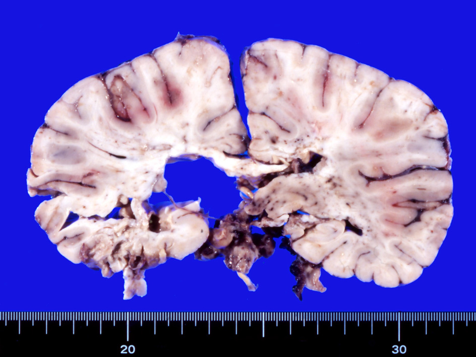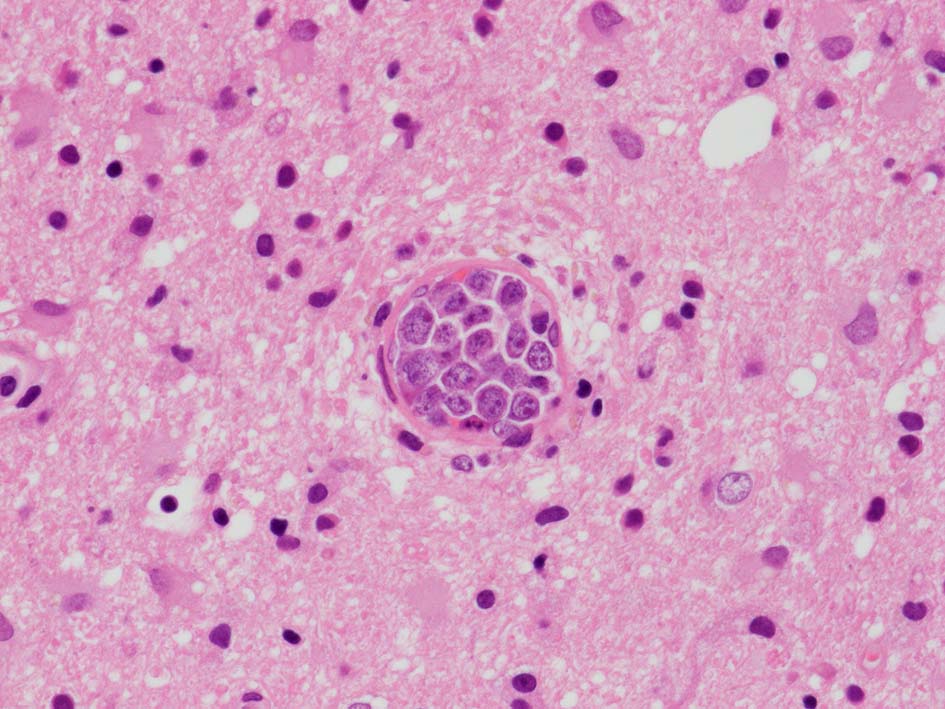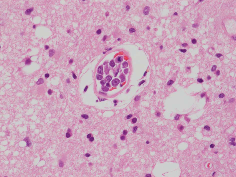 抗凝固療法をおこなう。その後MRIでは穿通枝梗塞増加. ビンスワンガー症状は動揺しながら若干悪化。ステロイド投与開始, 発語量増加, 独歩可能となる. しかし夜間せん妄出現. parkinsonism,痴呆症状が悪化した。骨髄穿刺:低形成髄。hemophagocytosisあり。異型細胞の増殖は認められなかった。追加MRI: 右放線冠などに急性梗塞が多発。抗凝固療法, ステロイドを持続, 発症より6ヶ月になり意識状態低下。CT, MRIで梗塞が急速に増加した。7ヶ月め深昏睡, 瞳孔散大, 永眠される。CTでは無数の梗塞により中心ヘルニアを呈していた。臨床上, 非定型的脳梗塞で最終的には血管内悪性リンパ腫症を疑い病理解剖をおこなった。