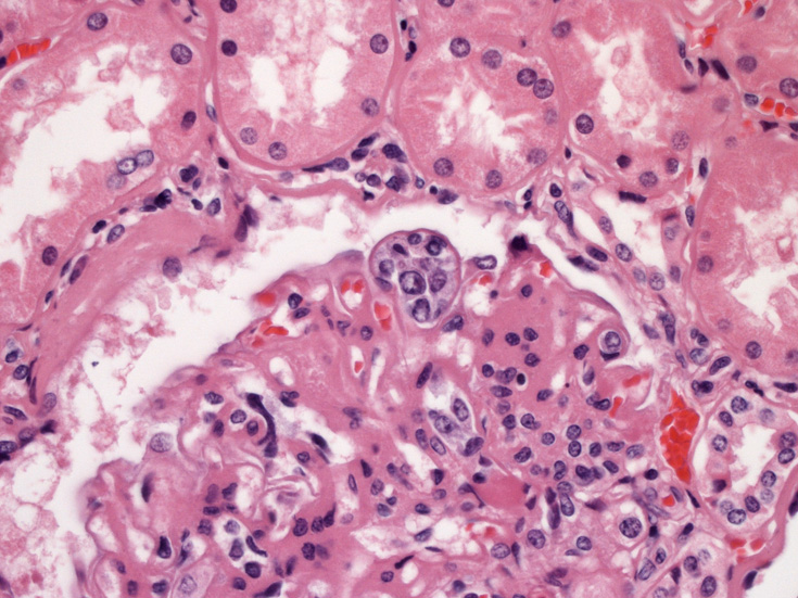 腎臓;糸球体係蹄内に腫瘍細胞が増殖するほか細腎動脈にもみとめられる。