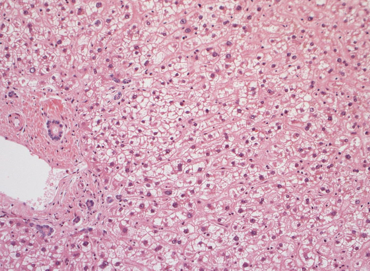 肝臓;グリソン鞘内、細肝動脈に腫瘍細胞あり。肝細胞は虚血のため変性しているようです。