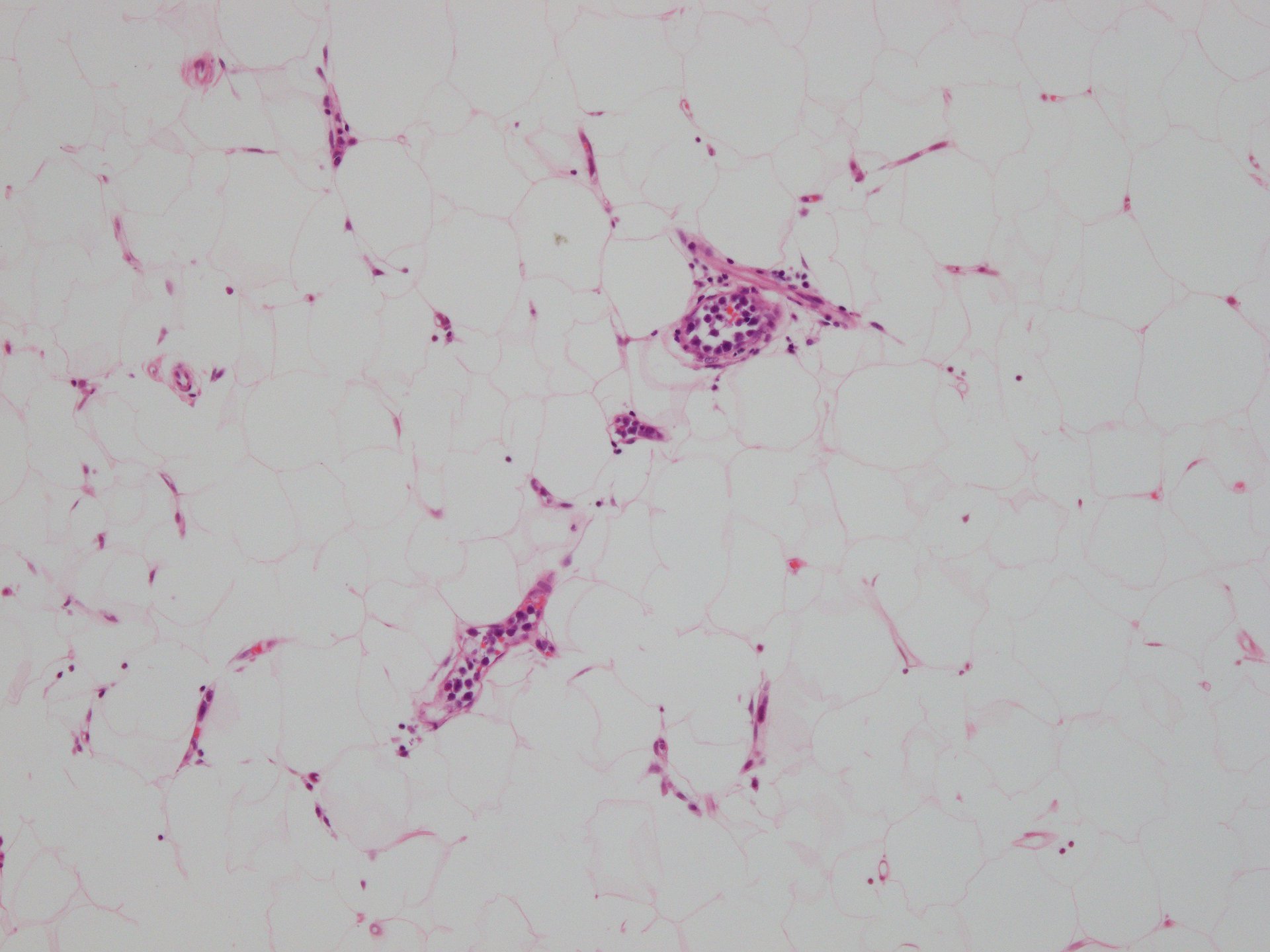 皮下脂肪織,細血管内の腫瘍細胞. 大型多型細胞より若干小さめの腫瘍細胞も認められる. CD20を先に染めておくと病変の有無がわかりやすい. HEだけで安易に「病変なし」としないほうがよい.
