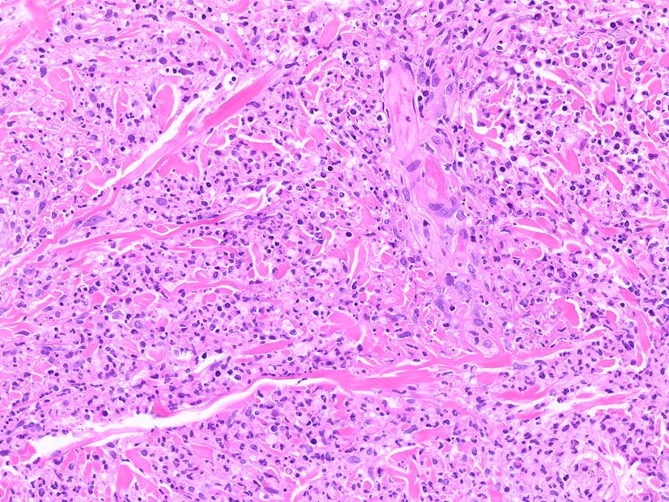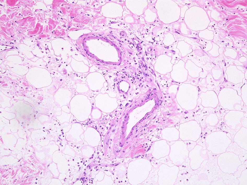 フィブリノイド壊死を呈する血管炎は認められない.皮下脂肪織炎病変には局所的なhemophagocytosisが認められる. 血管にはfibrinoid necrosisは見られない。