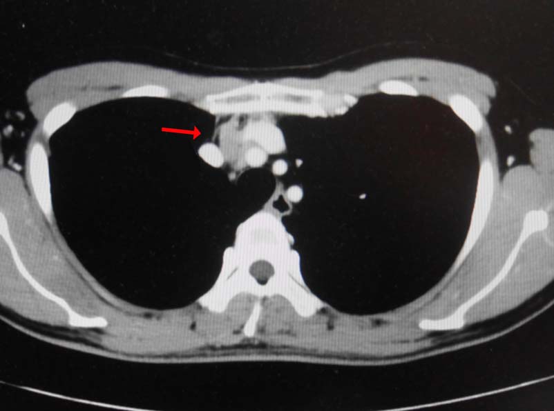 画像: 左精巣腫瘤. 縦隔リンパ節転移疑い.
