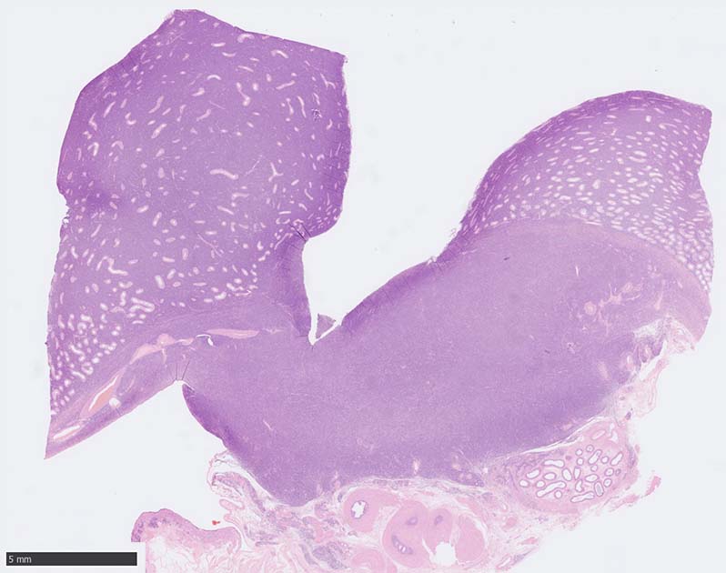 白膜には密に腫瘍性リンパ球が浸潤増殖し, 肥厚, 一部は上図loupe像のように, 腫瘤を形成している. 浸潤リンパ球は精巣実質内よりも, やや大きく, 多稜形, くびれのある核をもち, クロマチンは淡明で核小体が明瞭になってきている.