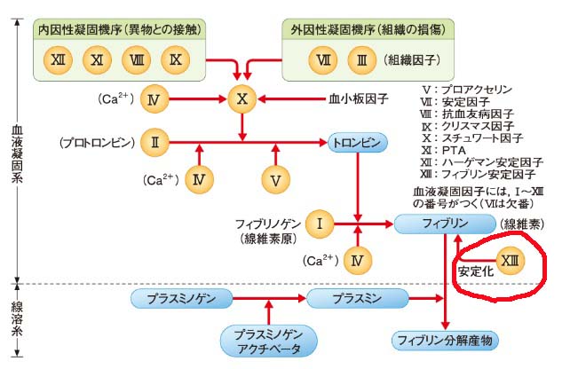 カルシウム依存性のトランスグルタミナーゼまたはトランスアミド化酵素であり, フィブリン分子間に分子間γ-グルタミル-イプシロン-リジン架橋を形成し、フィブリン凝塊の機械的安定化およびタンパク質分解に対する抵抗性をもたらす。また, ファクターXIIIaは細胞表面の分子や膜を安定化させる働きもあると考えられている.